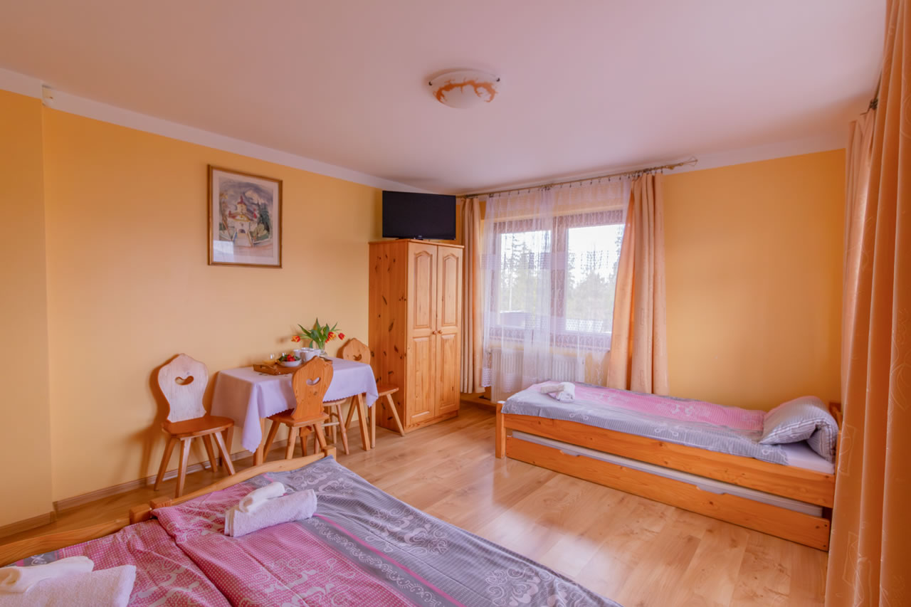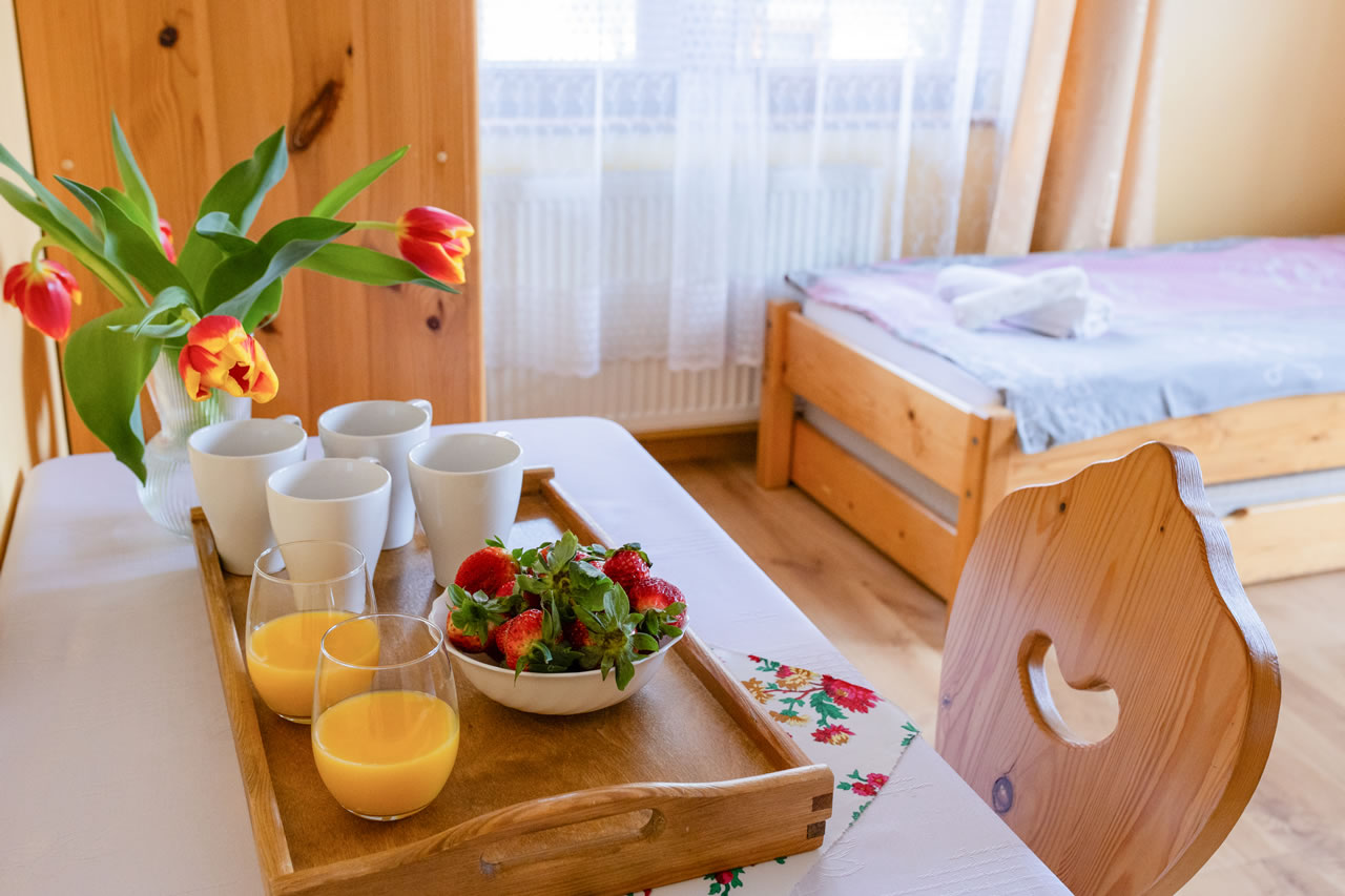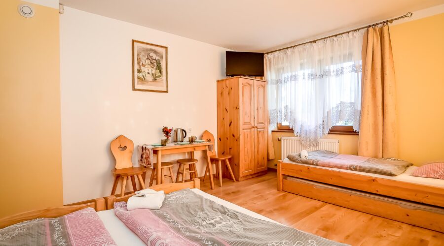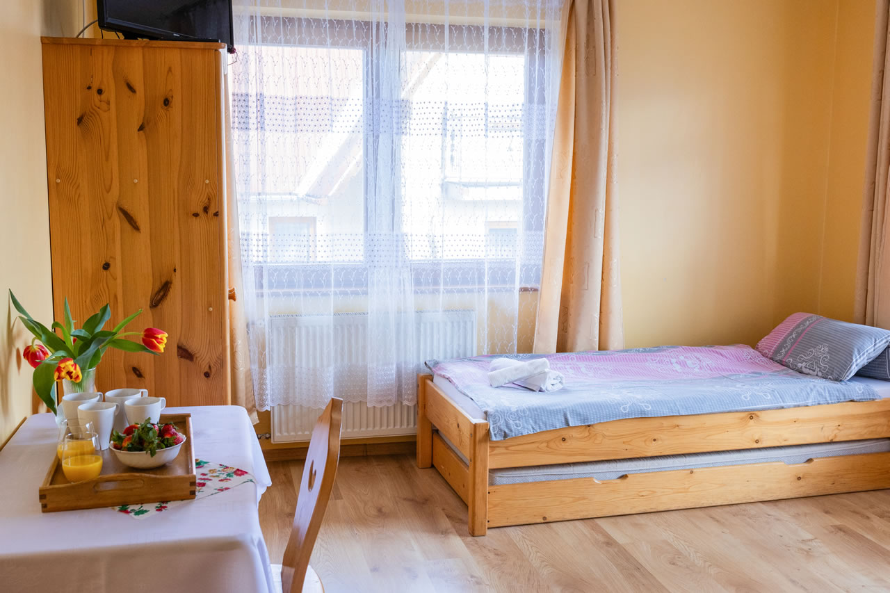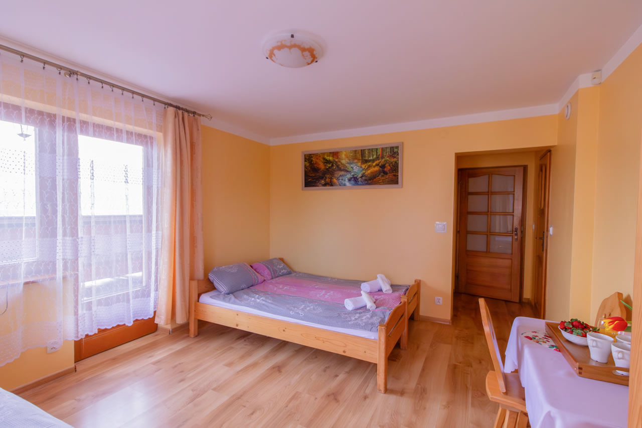 Z okien rozciąga się widok na panoramę Tatr. Pokój posiada wyjście na balkon.