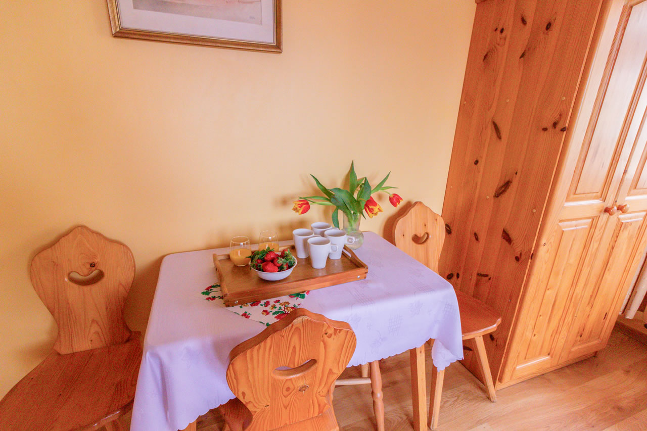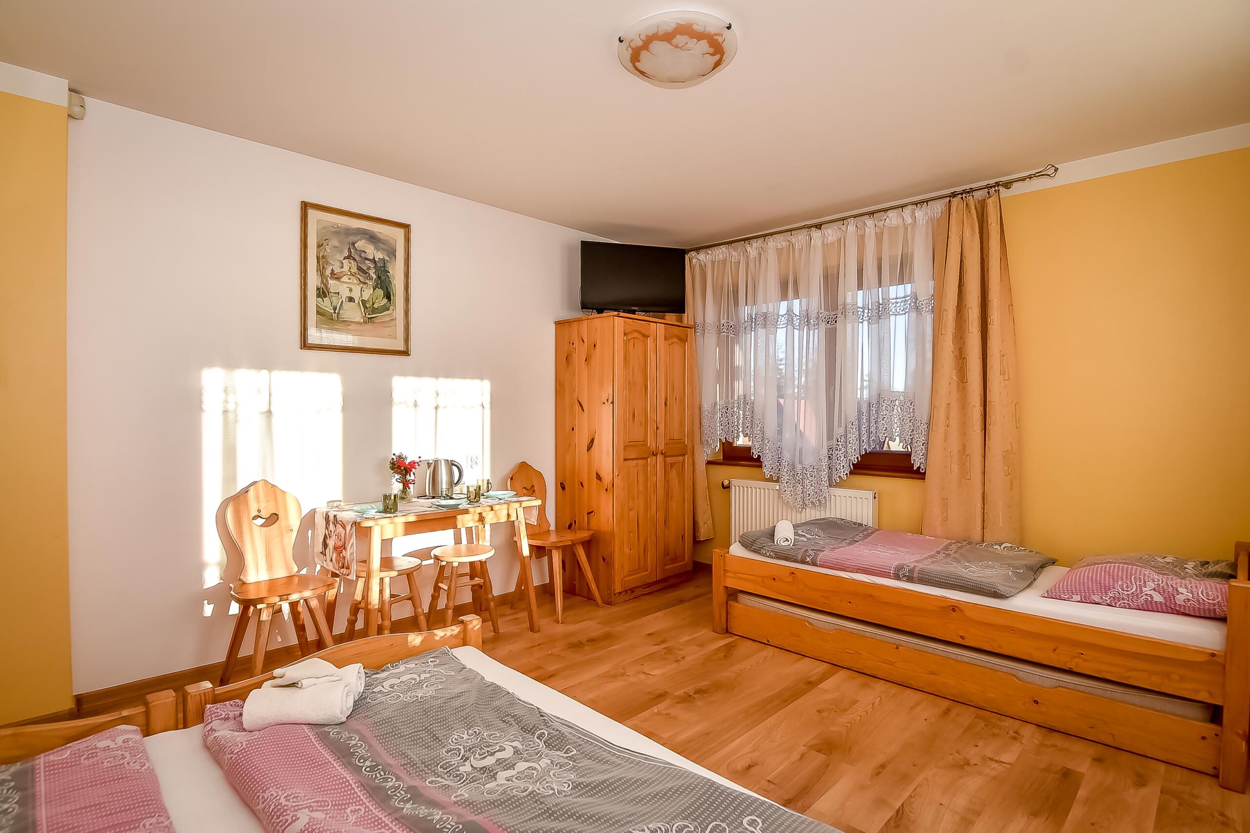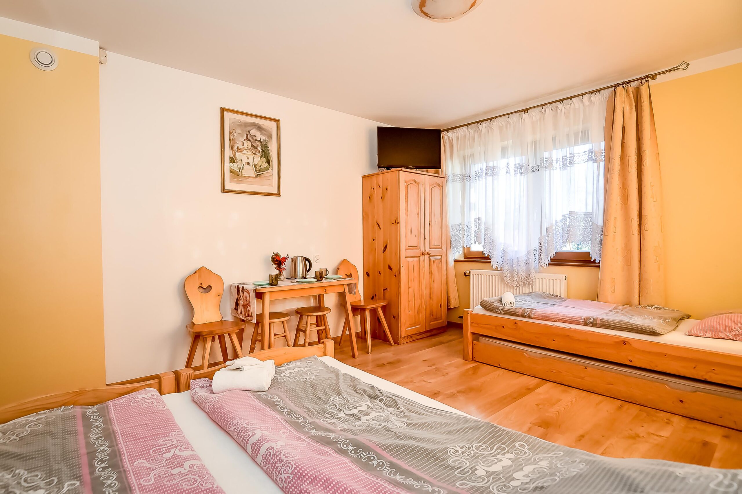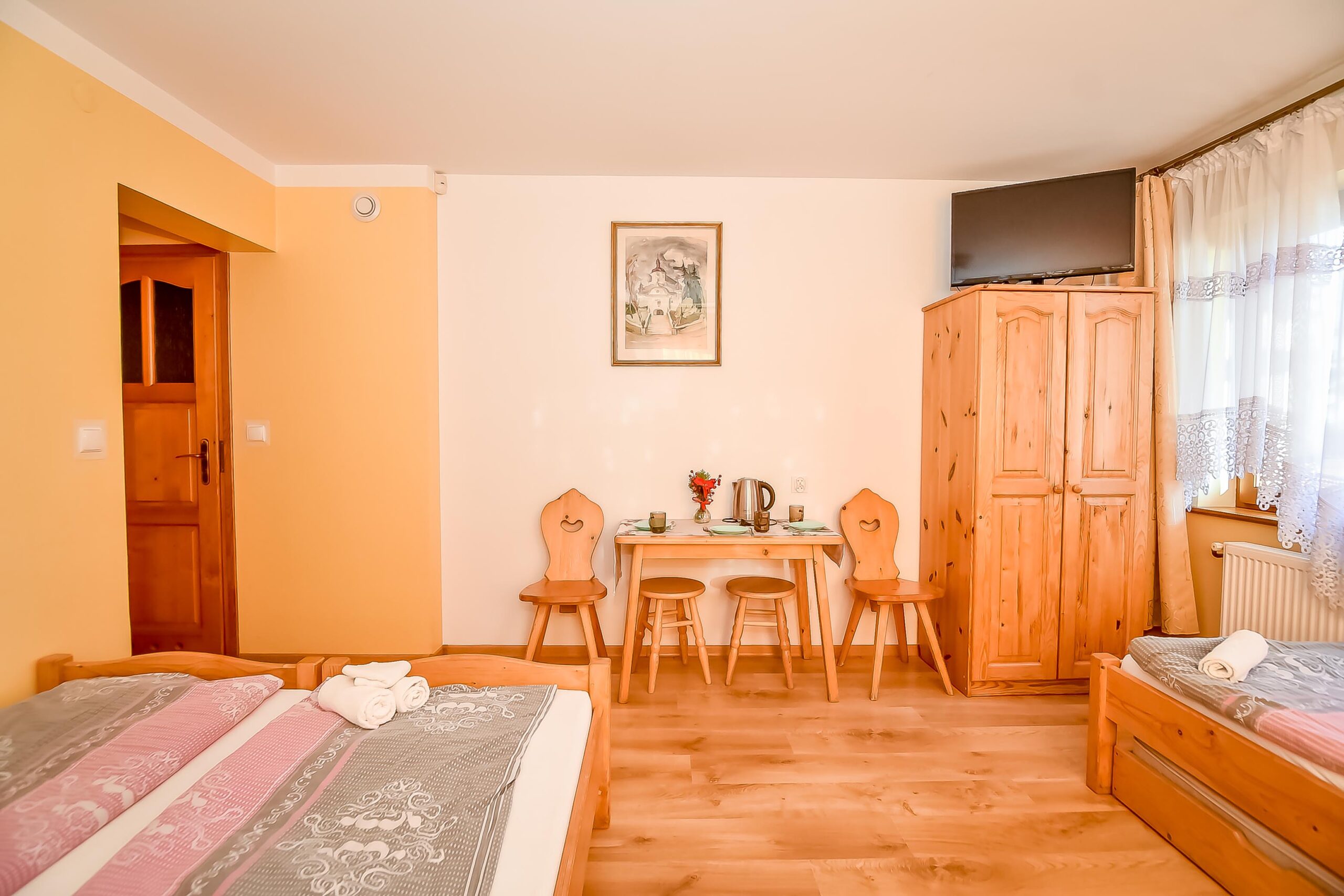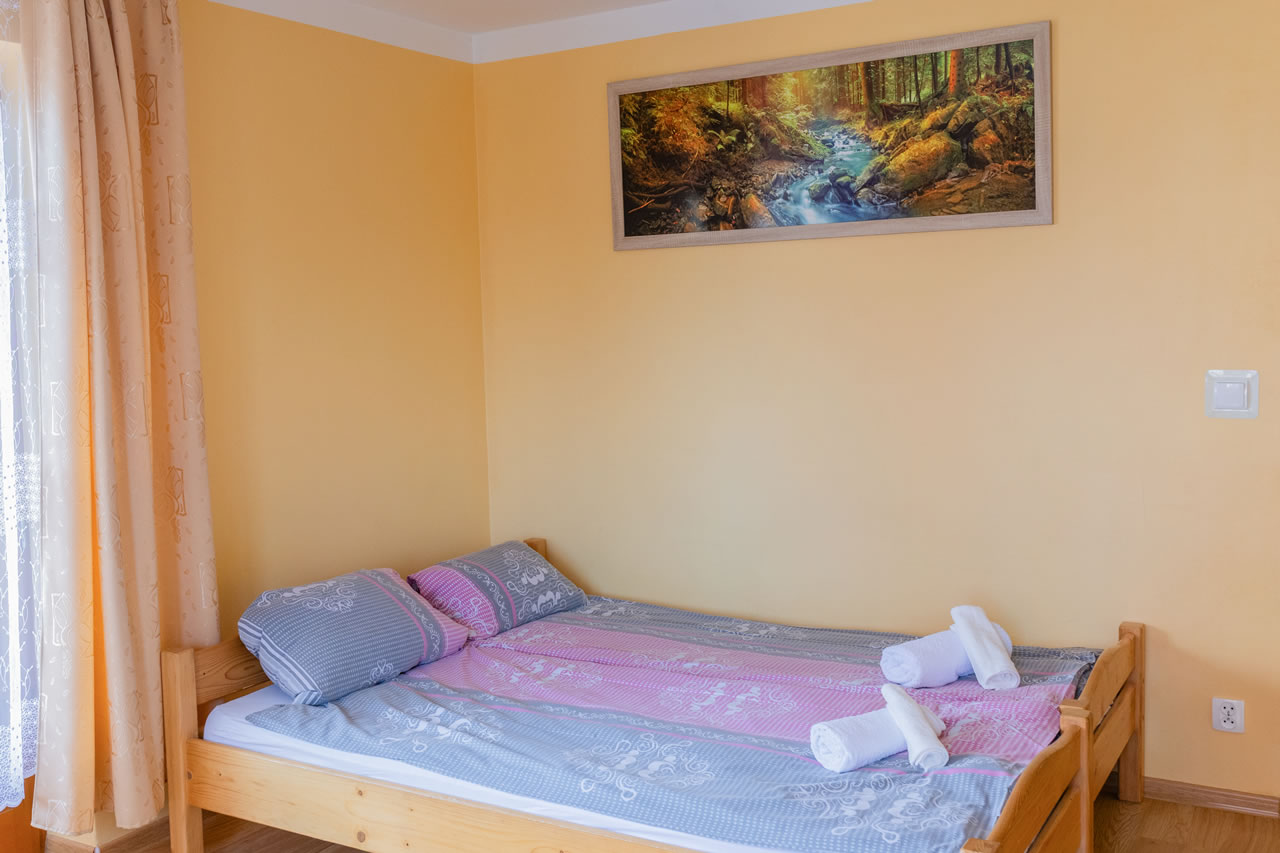 Z okien rozciąga się widok na panoramę Tatr. Pokój posiada wyjście na balkon.