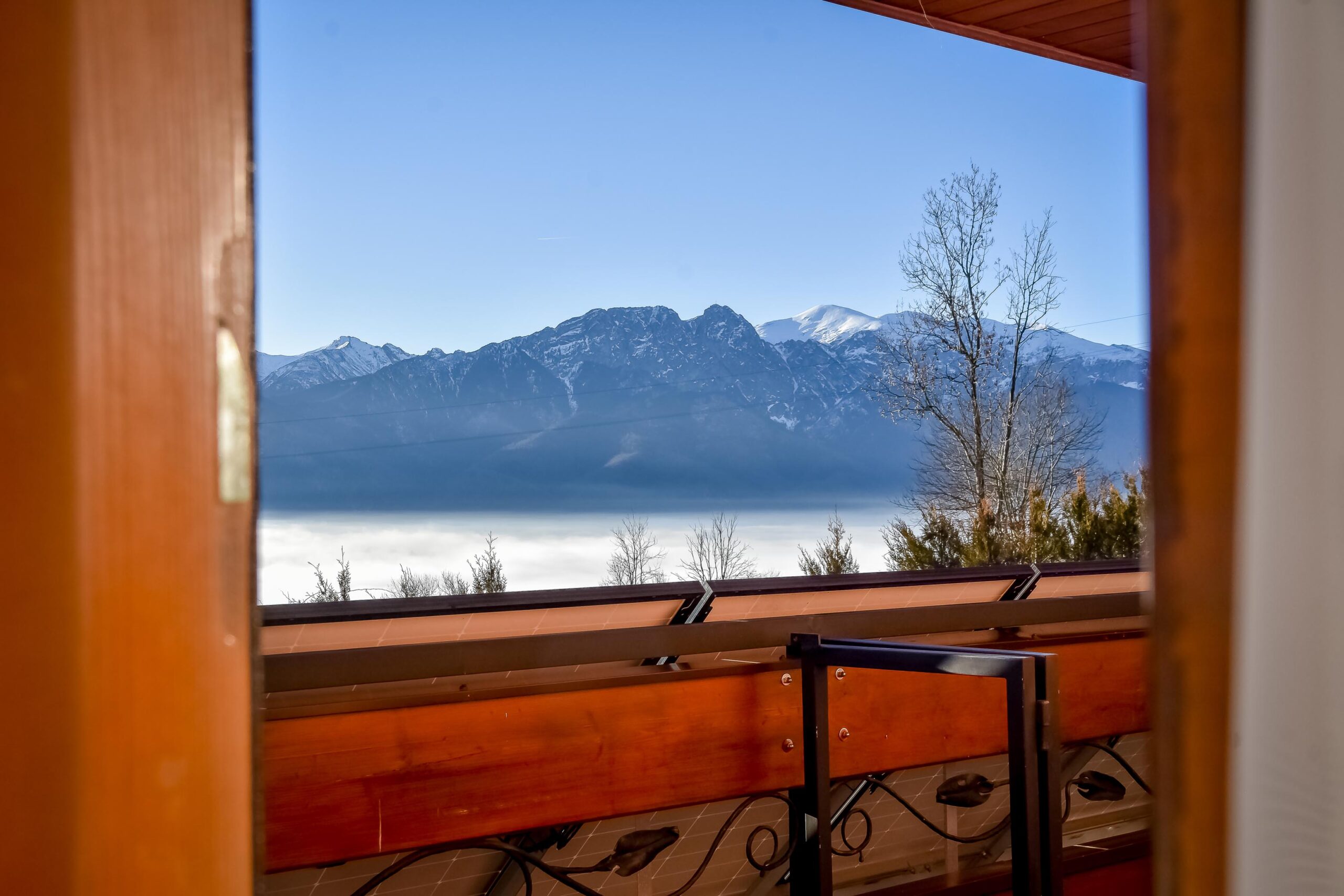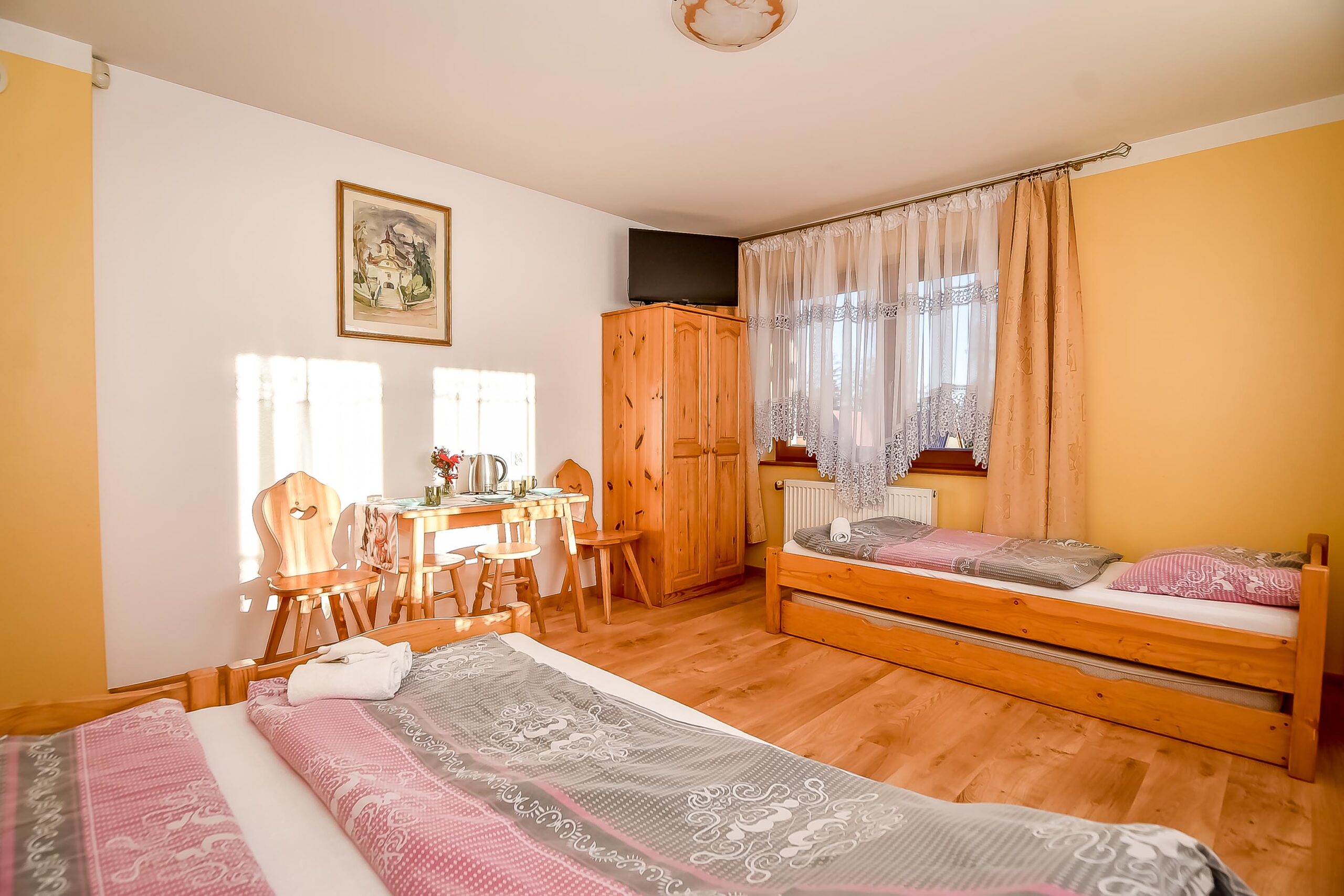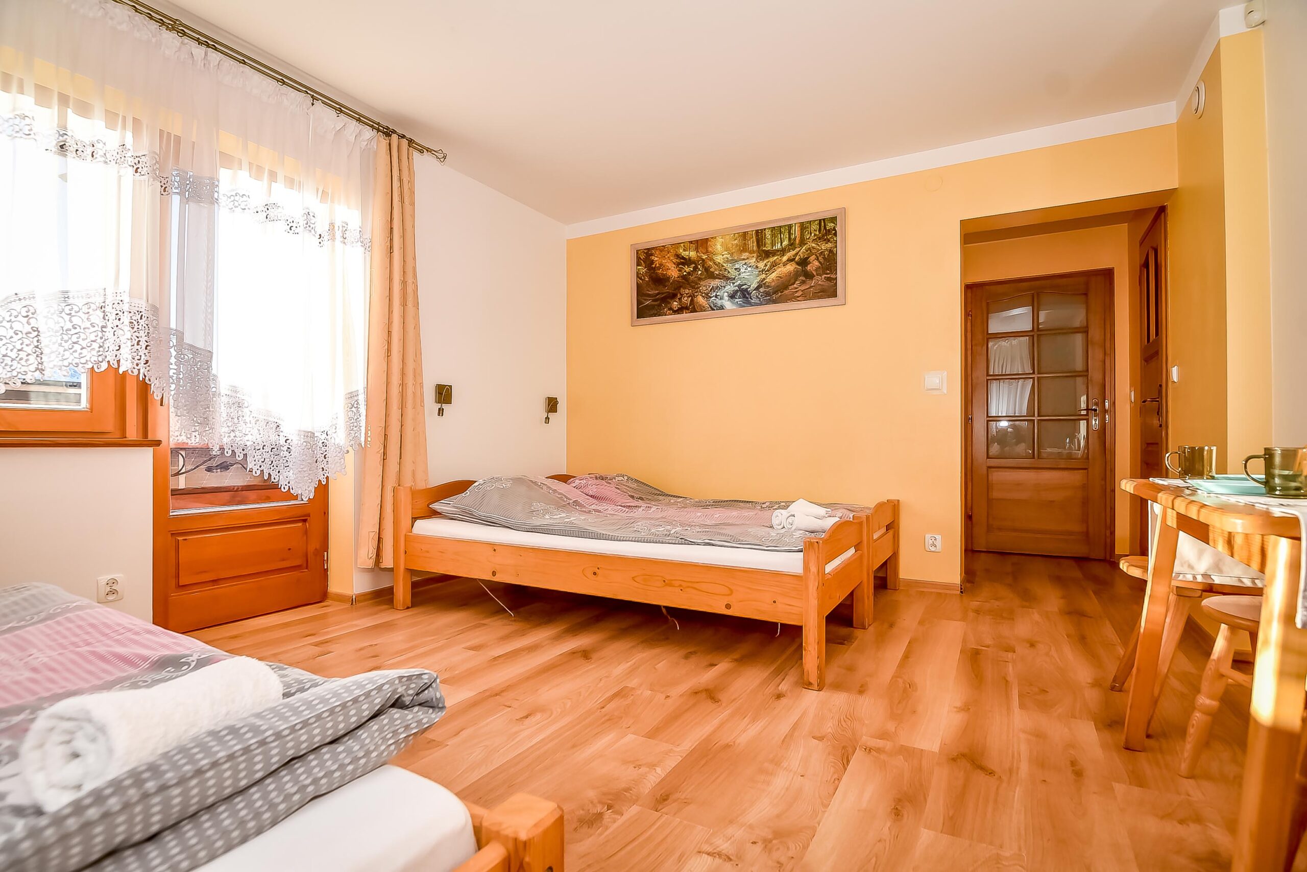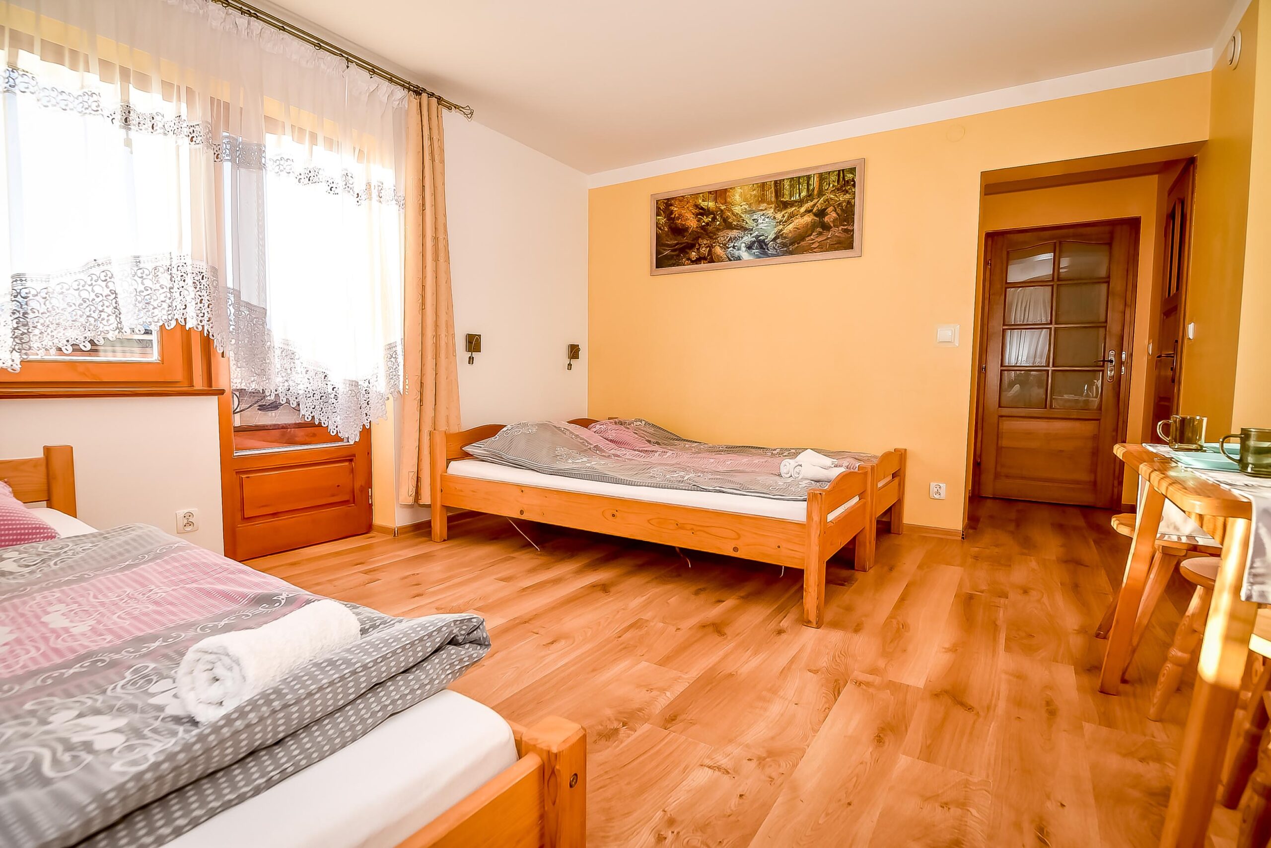 Z okien rozciąga się widok na panoramę Tatr. Pokój posiada wyjście na balkon.