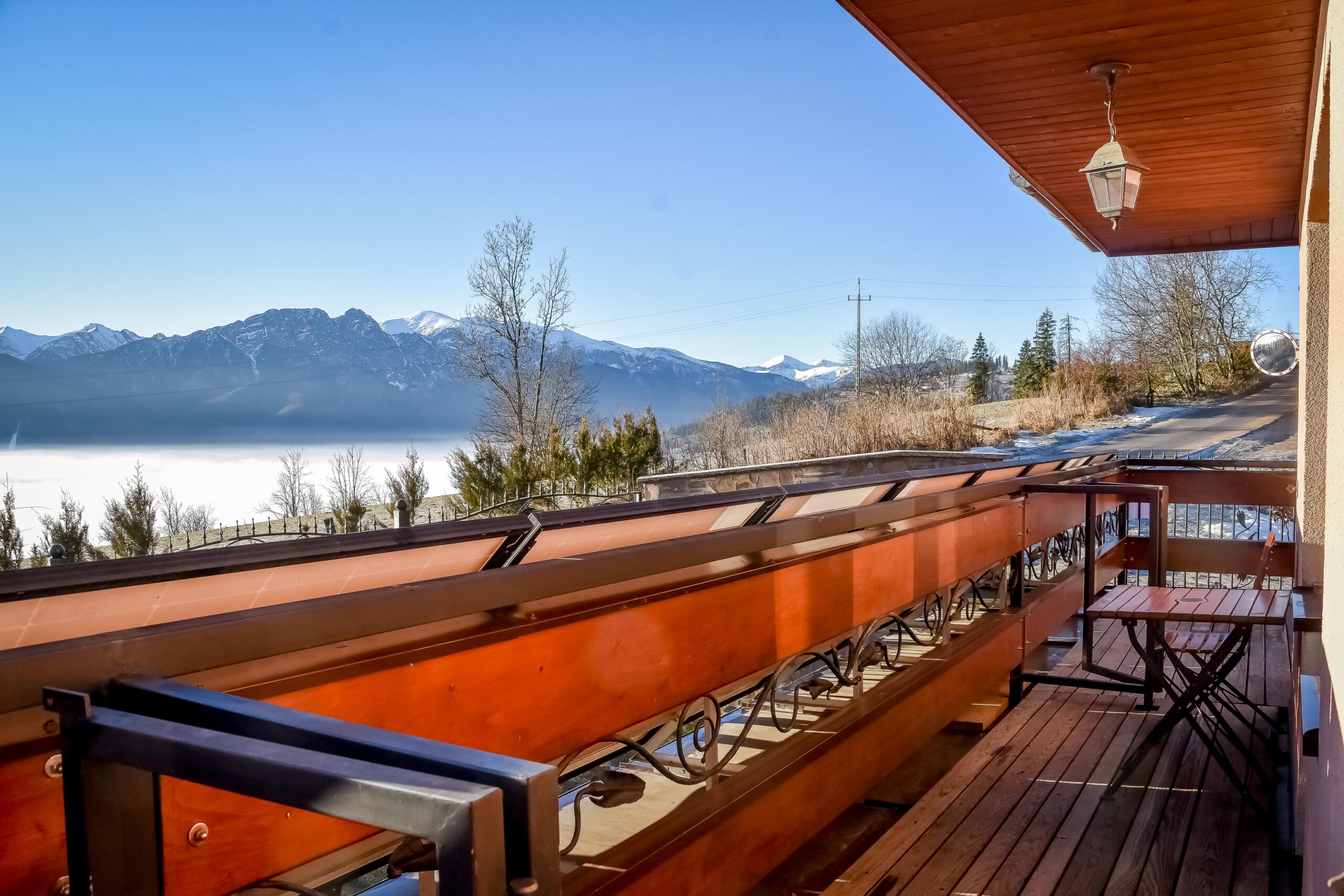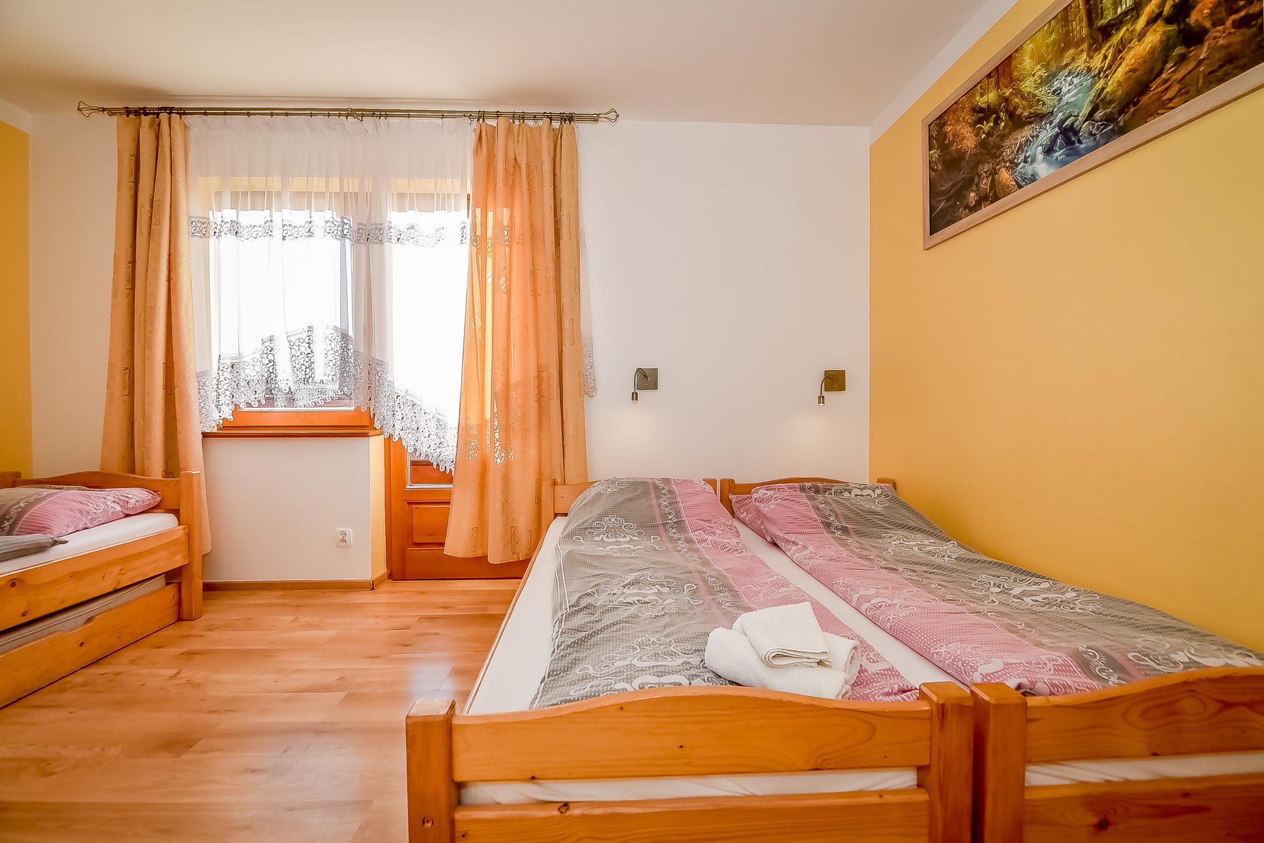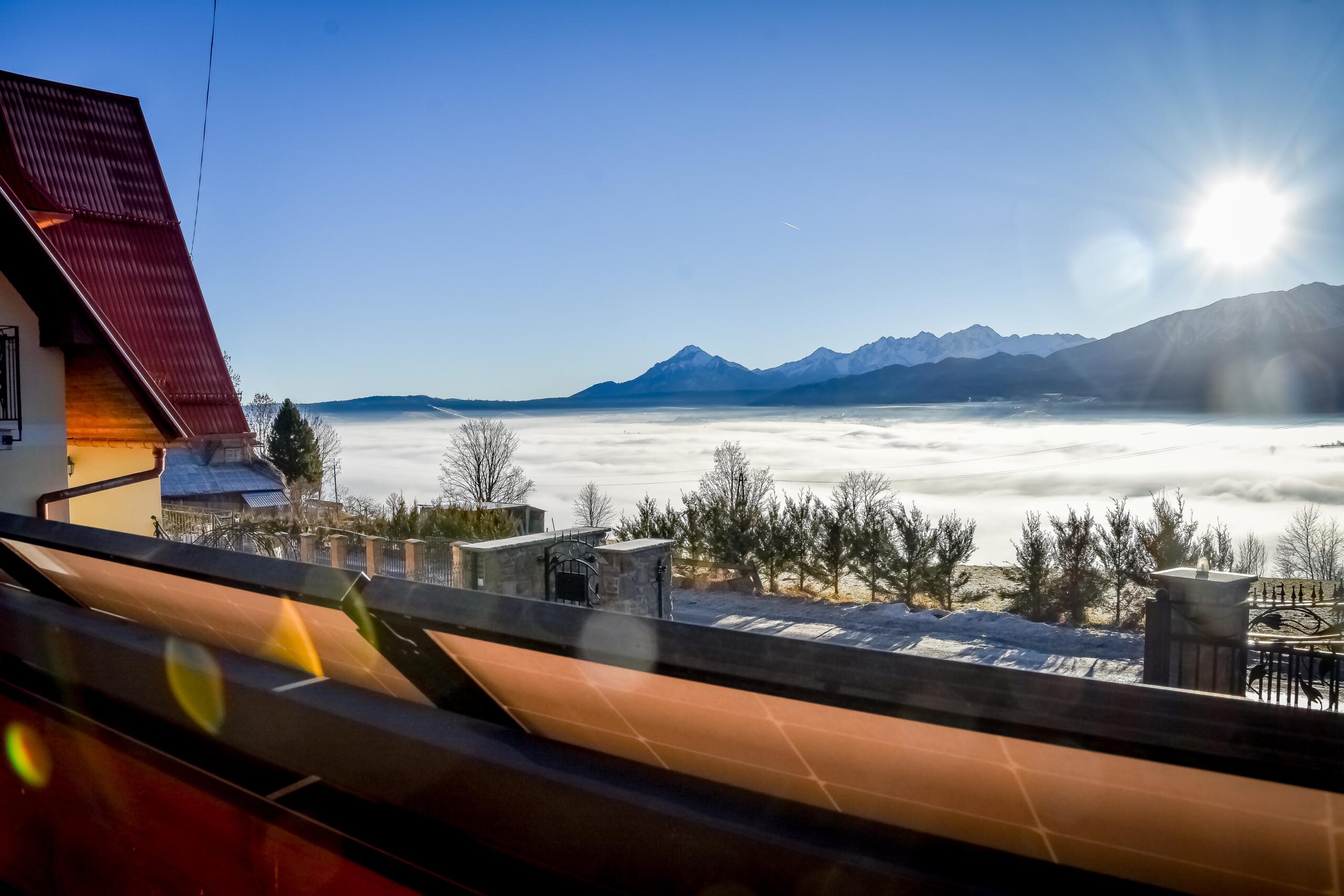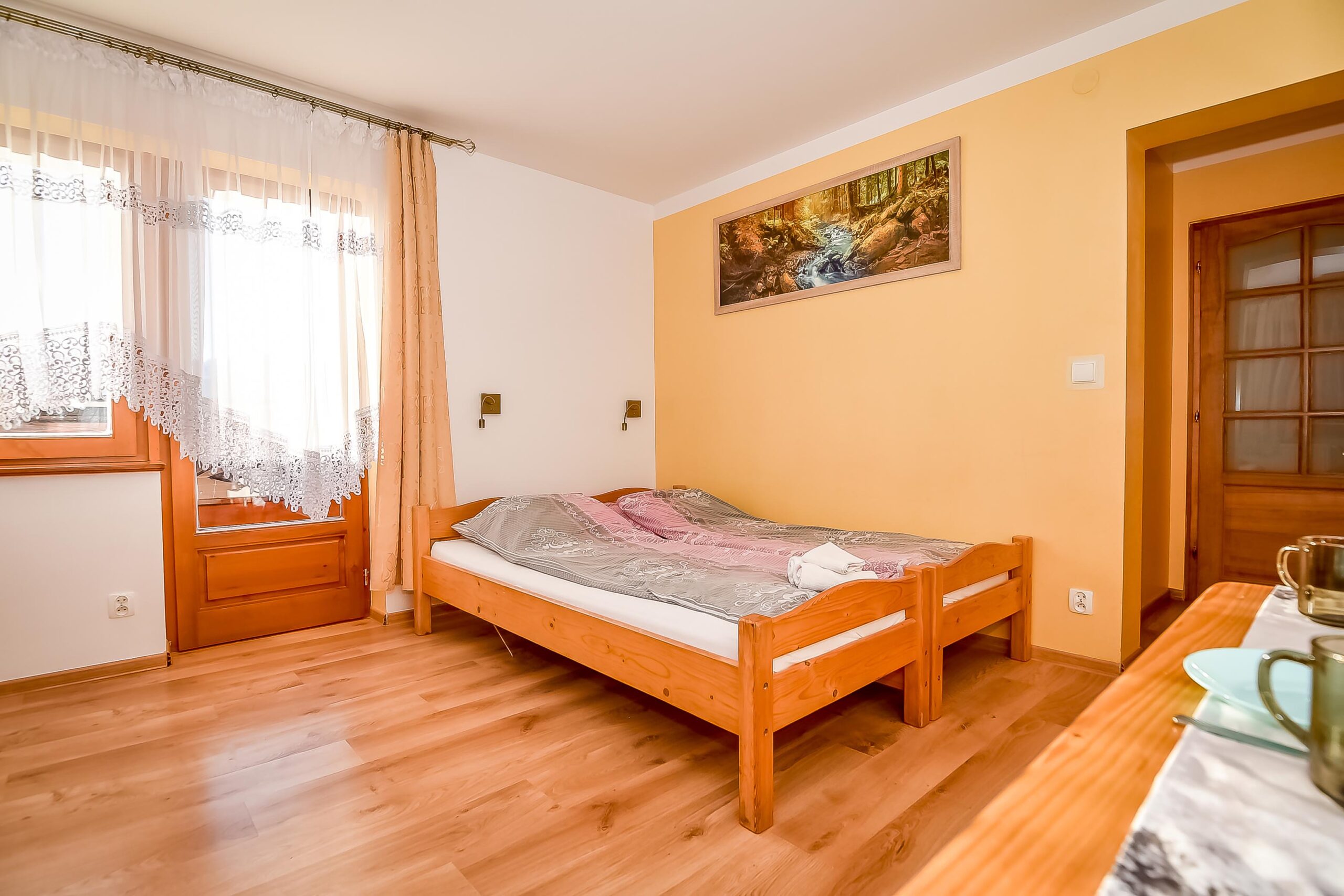 Z okien rozciąga się widok na panoramę Tatr. Pokój posiada wyjście na balkon.
